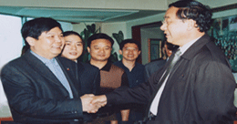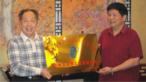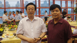 時(shí)任河南省人民政府省長(zhǎng)郭庚茂先生(左)與臺(tái)州商會(huì)支部書(shū)記、《百花散》傳人梅安富先生合影