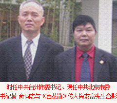 全國(guó)政協(xié)副主席、中共中央委員、中國(guó)殘聯(lián)主席鄧樸方先生與鄭州臺(tái)州商會(huì)支部書(shū)記兼秘書(shū)長(zhǎng)、《百花散》傳人梅安富先生親切交談鄭州市腫瘤康復(fù)協(xié)會(huì)名譽(yù)會(huì)長(zhǎng)。2005年5月,作為臺(tái)州古代中醫(yī)秘方梅氏《百花散》